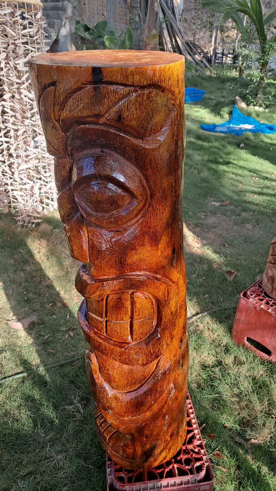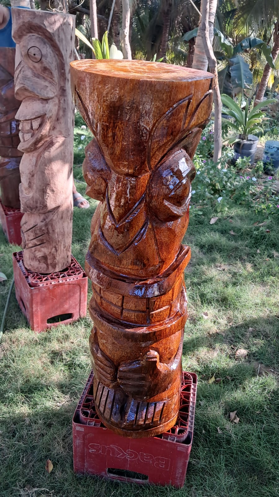 Descripción: Esta escultura de madera, representando a un Tiki, es una pieza única y poderosa que evoca la cultura y las tradiciones de las islas del Pacífico. Tallada a mano por artesanos locales, la escultura captura la esencia de los Tiki, que son considerados símbolos de protección y guardianes ancestrales.